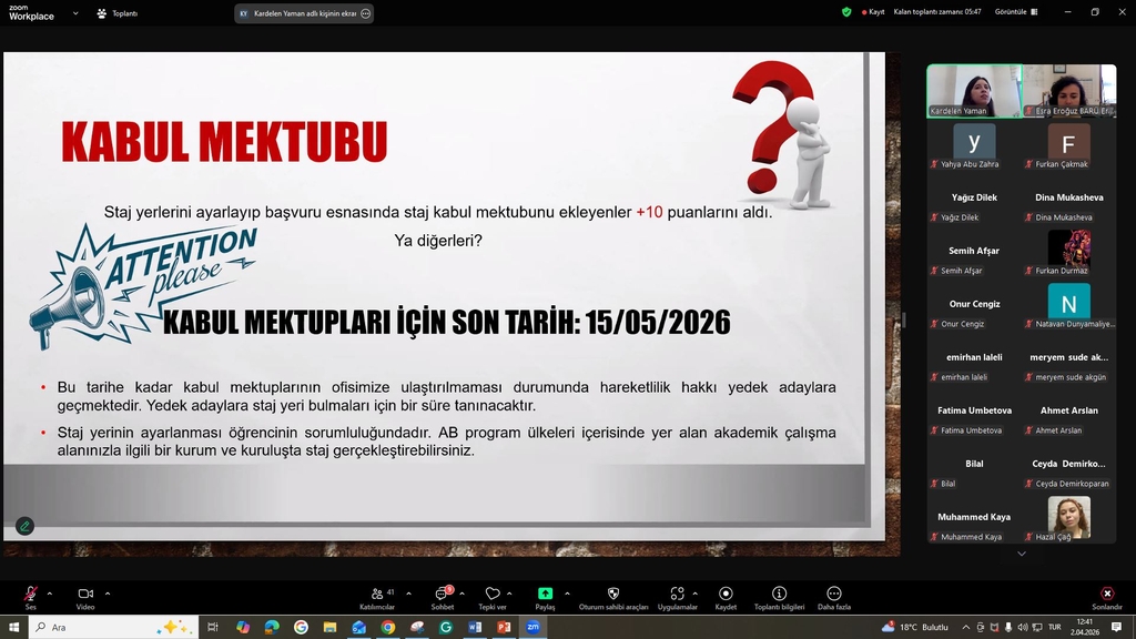 Toplantıda, hareketlilik sürecine ilişkin genel bilgilendirmeler yapılmış; başvuru sonrası işlemler, gerekli belgeler, hibeler, akademik tanınma süreci ve dikkat edilmesi gereken hususlar detaylı olarak öğrencilere aktarılmıştır. Ayrıca öğrencilerden gelen sorular yanıtlanarak süreç hakkında kapsamlı bir bilgilendirme sağlanmıştır.